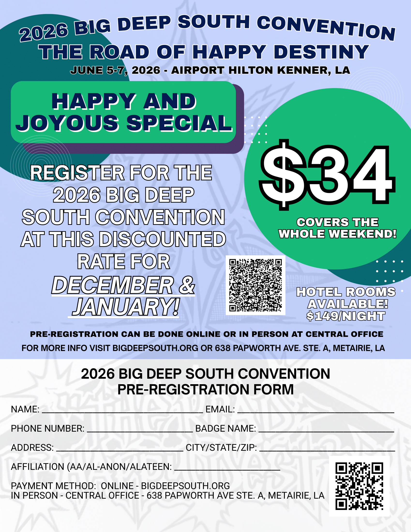 Register & Add-Ons Happy And Joyous Special Pre-Registration Big Deep South 2026 Register today for Big Deep South Convention 2026 (June 5-7) in Kenner, LA. $34.00 Gratitude Special Early Bird Pre-Registration $28.00